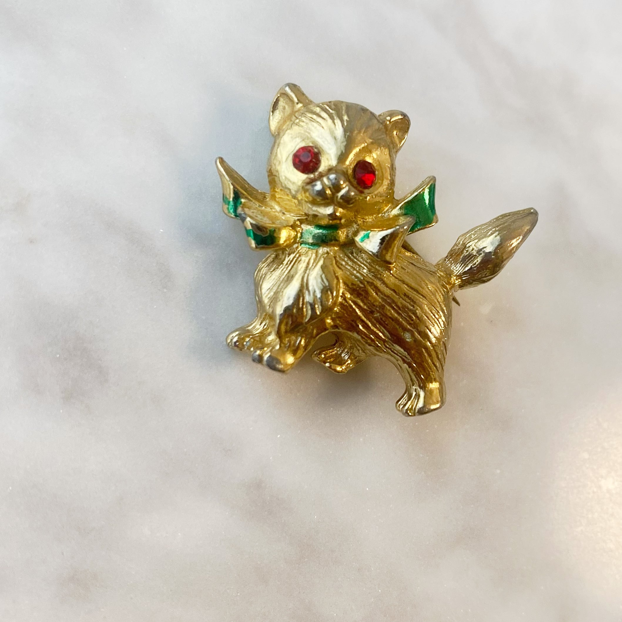 首にグリーンのリポンをつけておめかししたネコのヴィンテージブローチです。