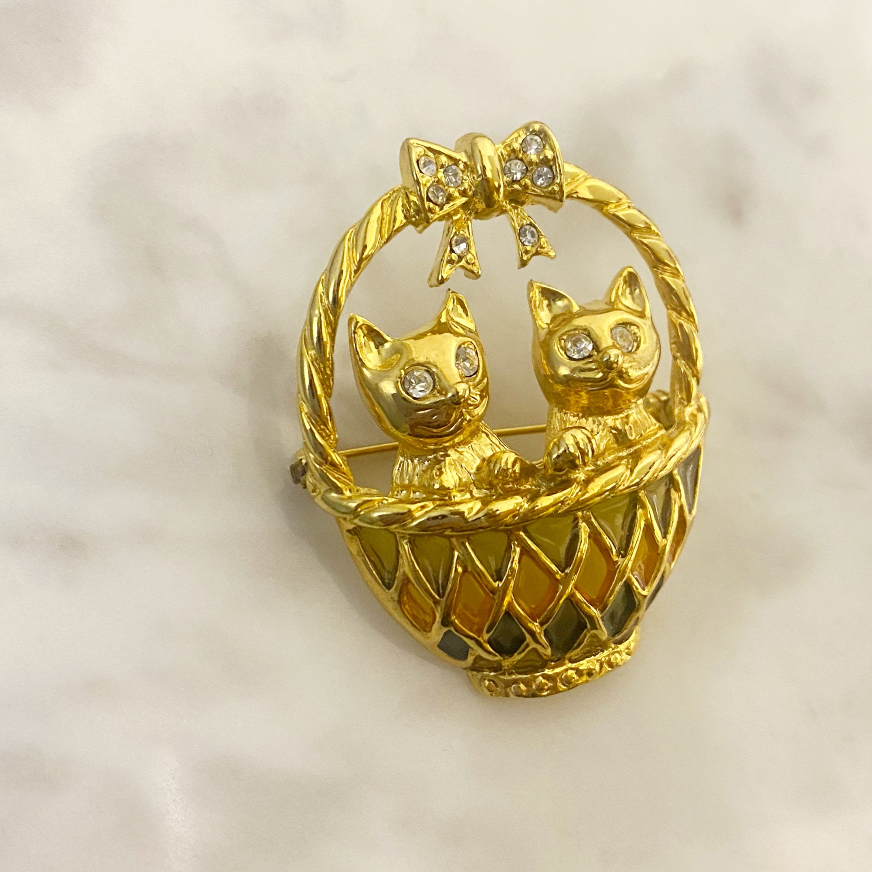 なんともかわいらしい2匹のネコがきれいな色のバスケットに入ったヴィンテージブローチです。