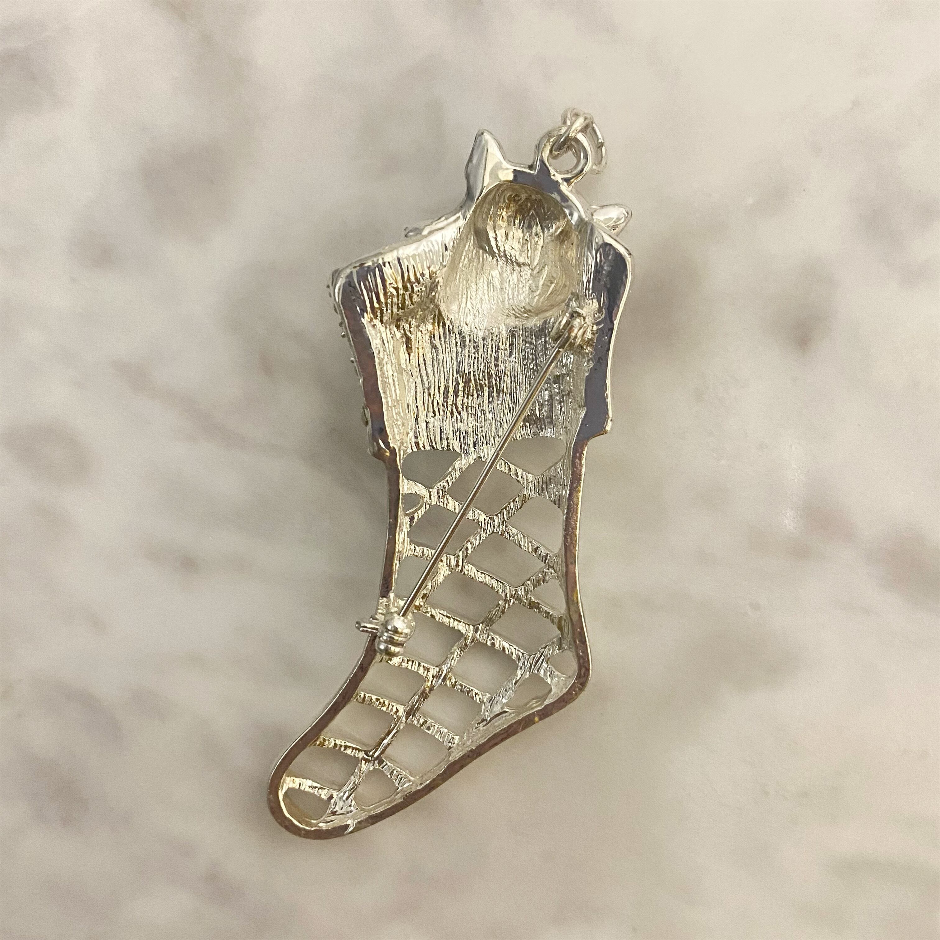 シルバーとラインストーンの靴下に入ったネコのブローチ