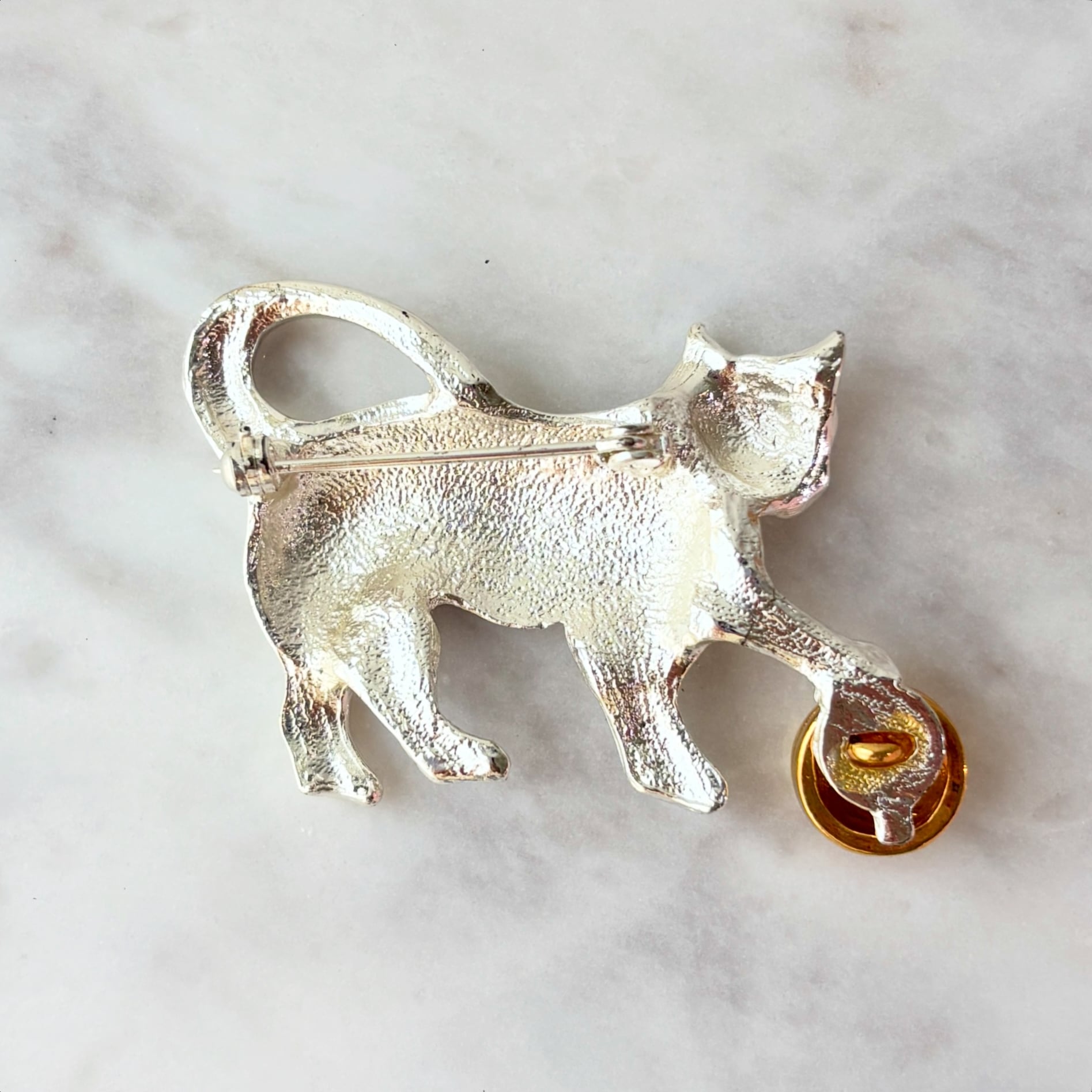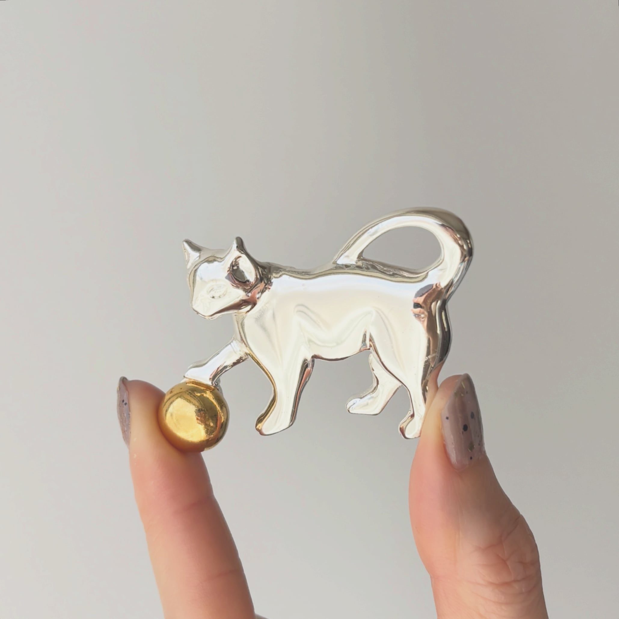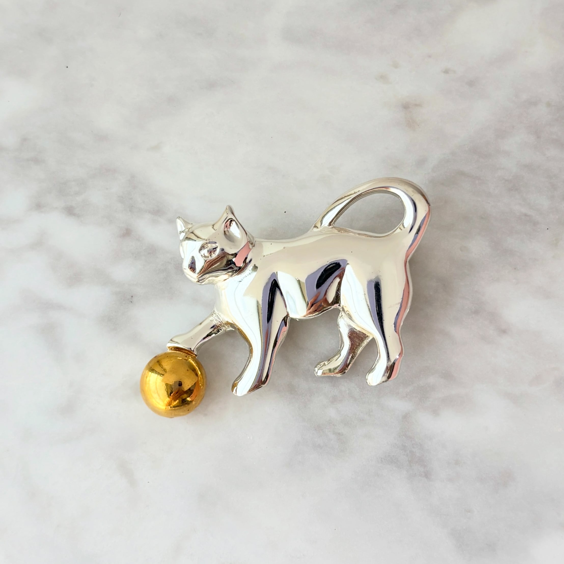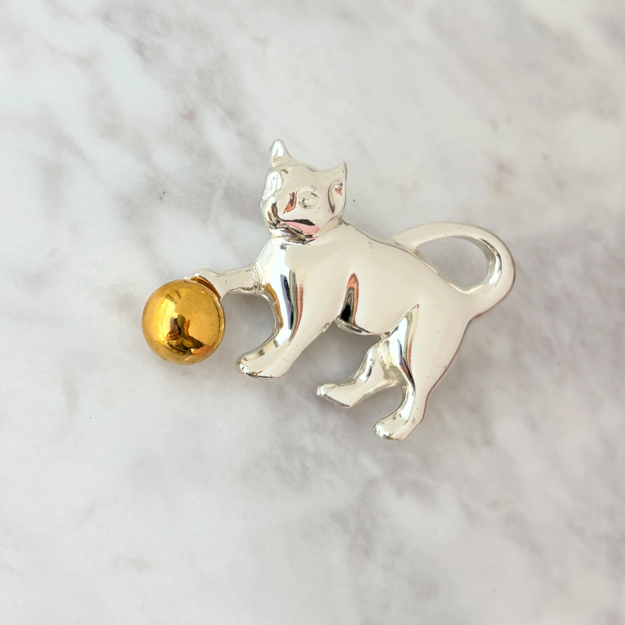 ボールで遊ぶシルバートーンのネコがかわいらしいヴィンテージブローチです。 ネコのシルエットがきれいで、ゴールドトーンのボールがアクセントになっています。 サイズ:約W5.7×H3.7cm *ブローチストッパーをご希望の方は下記の[ブローチストッパーの追加]のところからご希望の個数を追加してください。 ブローチストッパーのご使用方法はナビゲーションのブローチの落下防止についてをご確認ください。
