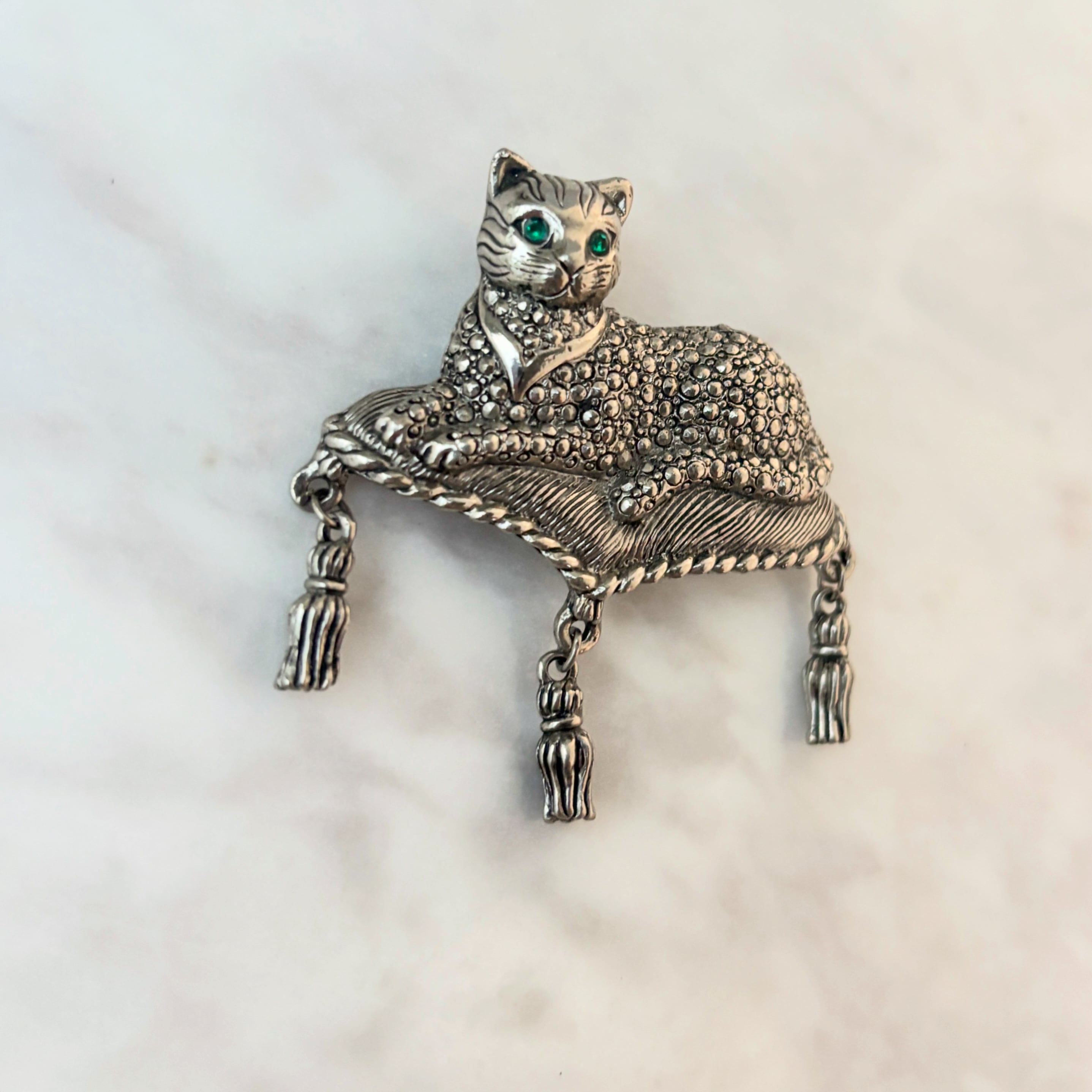 美しいグリーンの目の首飾りをした気品のあるネコが、タッセルのついたクッションでくつろいでいるデザインのブローチです。