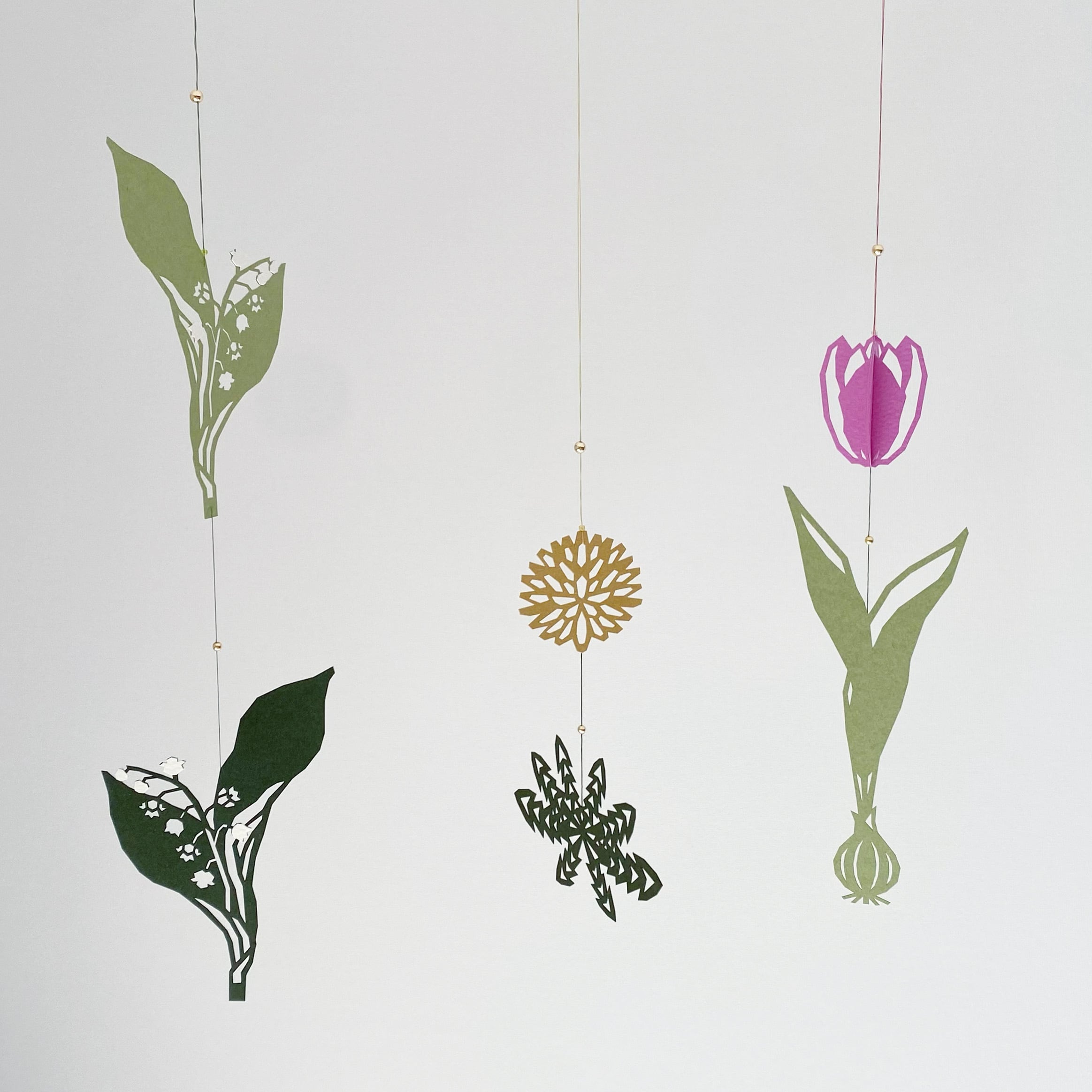 吉浦さんの作るモビールは、針金を使って、バランスをとるように構成したものではなく、デザインナイフを使って一つ一つ丁寧に切り出したピースを、糸でつないでつくるものが中心です。