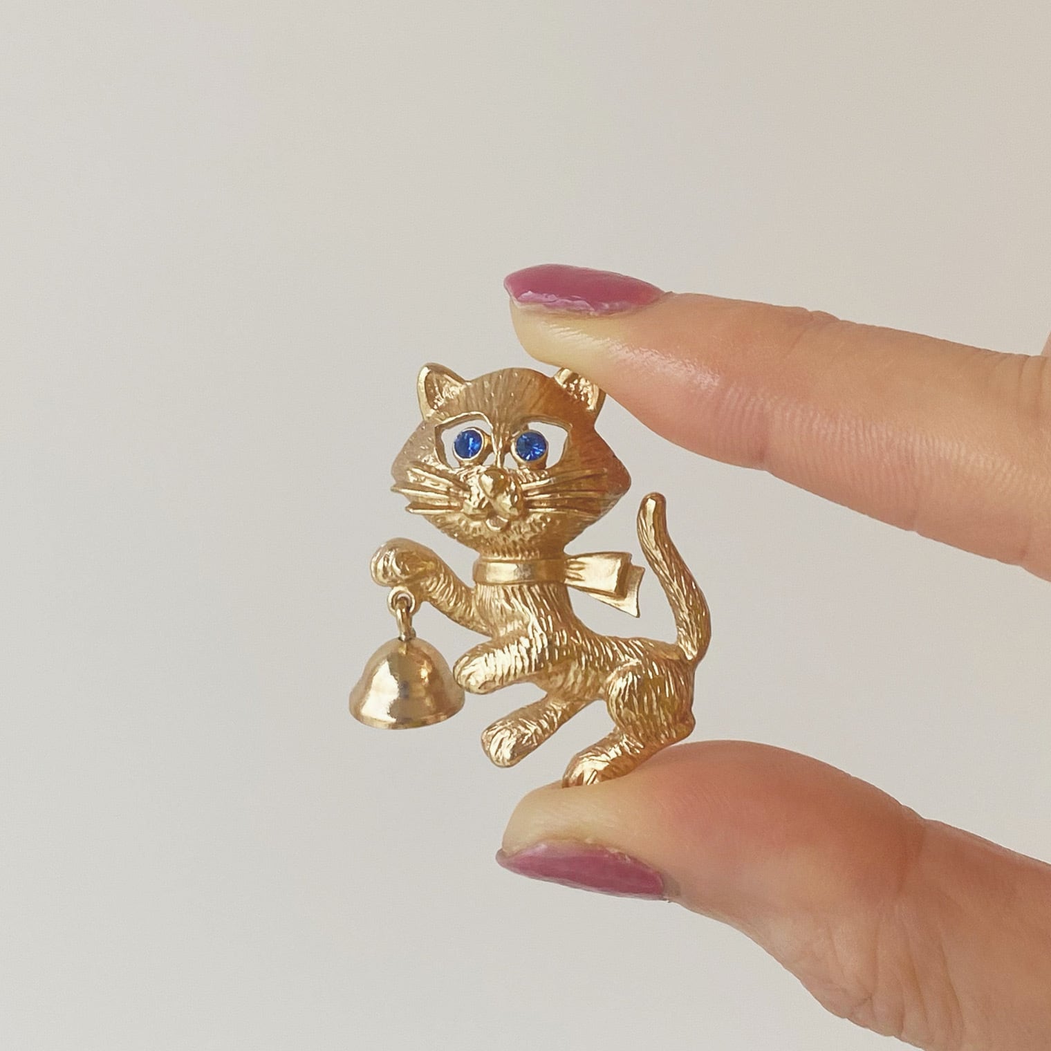 ブルーのラインストーンの瞳がかわいらしいネコがベルを持ったデザインです。